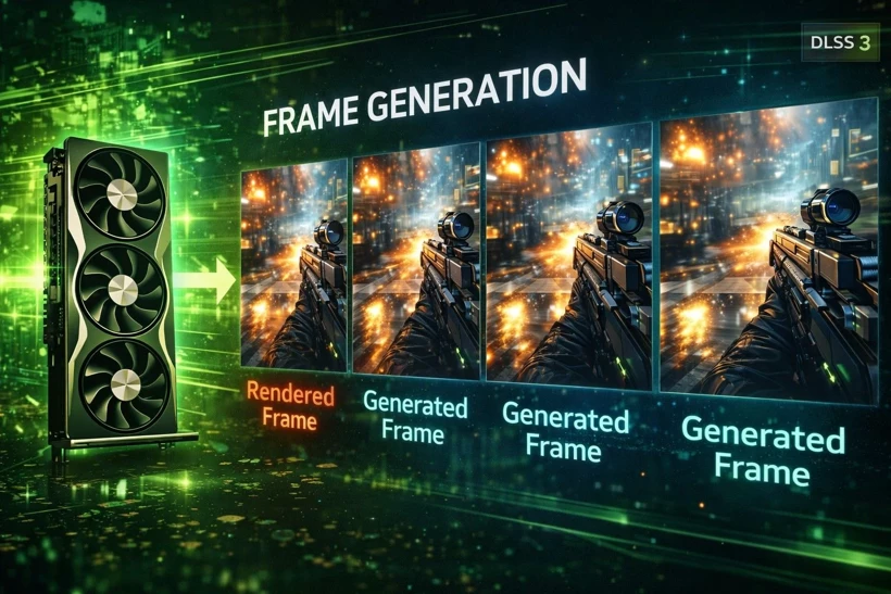 RTX 40 serisiyle birlikte NVIDIA, kare üretimi teknolojisini sundu. Bu sistem, kartın oluşturduğu her kare için ek kareler üretmesine olanak tanıyor. 50 serisiyle birlikte bu teknoloji daha da ileri taşındı ve tek kareden üç ek kare üretilebiliyor.